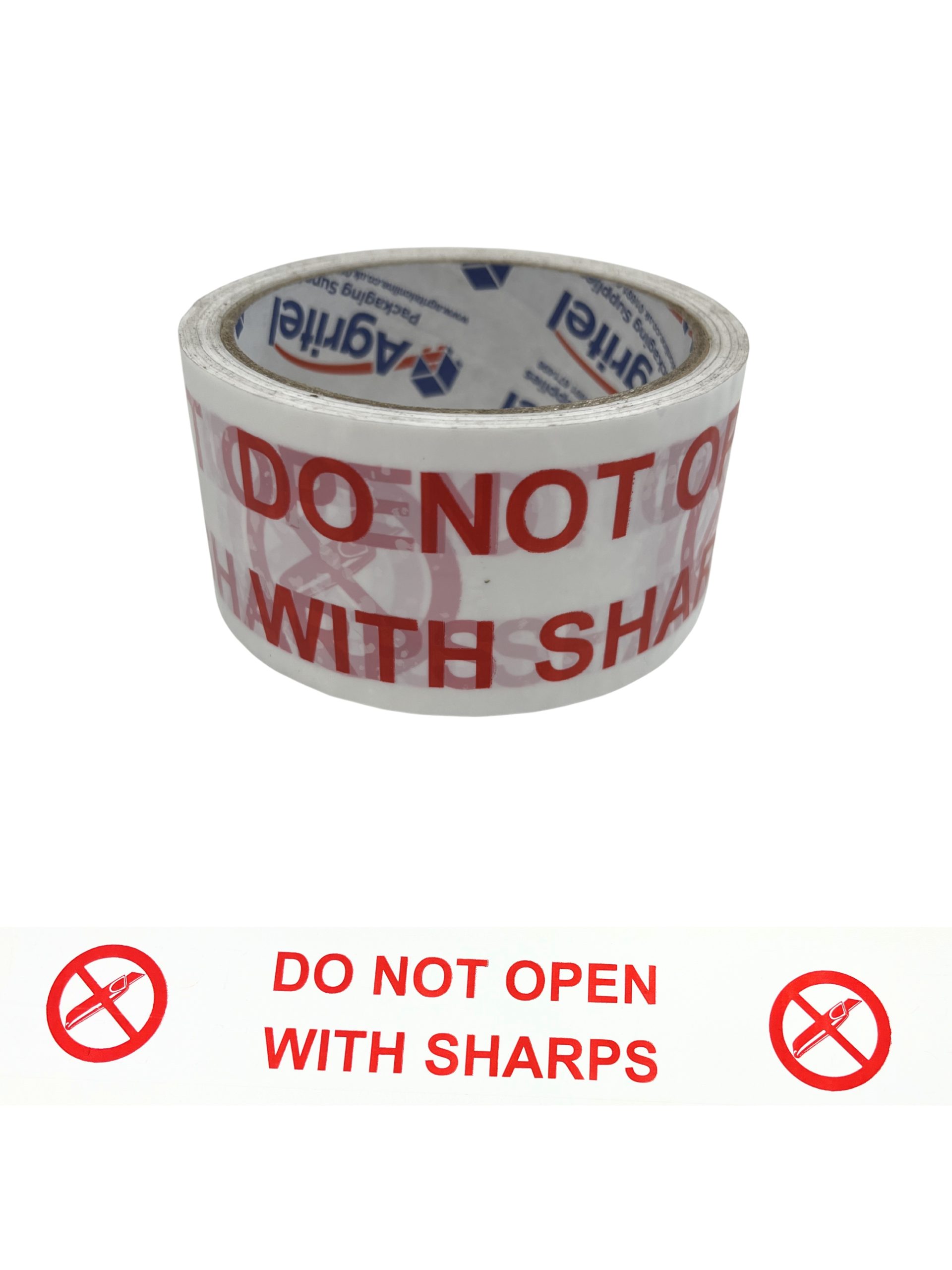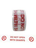 Boldly printed ‘DO NOT OPEN WITH SHARPS’ tape with Red text on a white background.